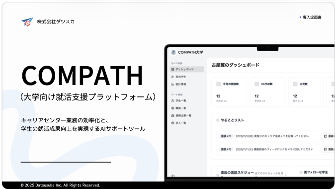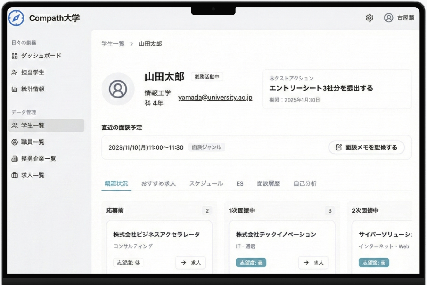 学生がアプリにログインするだけで、就活の進捗をAIが見守ります。その学生が参加したイベント、受けている企業の状況などを確認して共有するので、該当学生を探し回る必要がなくなります。